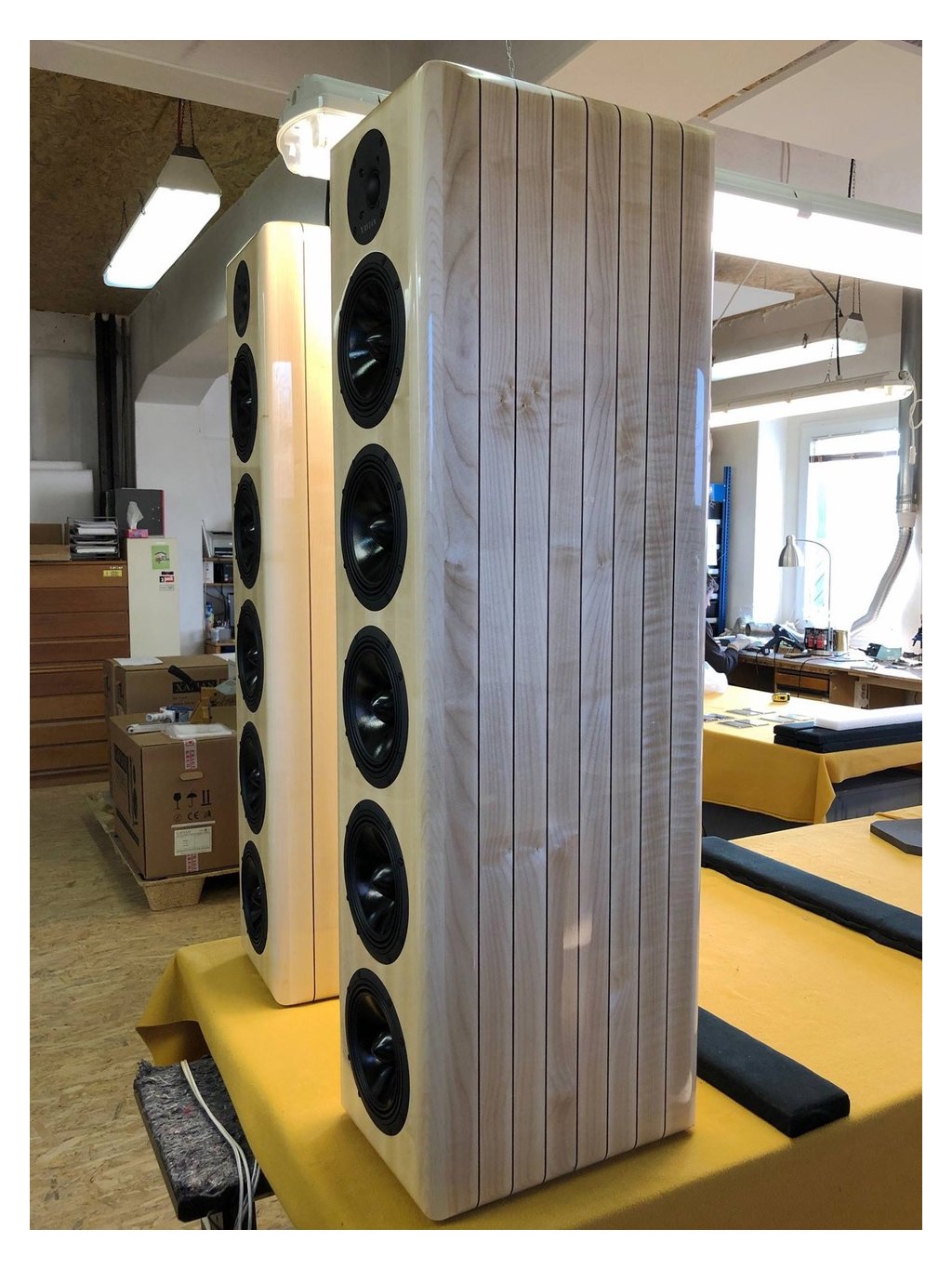 Třípásmový tlumený bassreflex, dva hliníkové bassreflexy s předními/zadními zaoblenými porty pro minimalizaci turbulencí, součástky Mundorf: odpory a olejové kondenzátory s velice nízkou tolerancí |