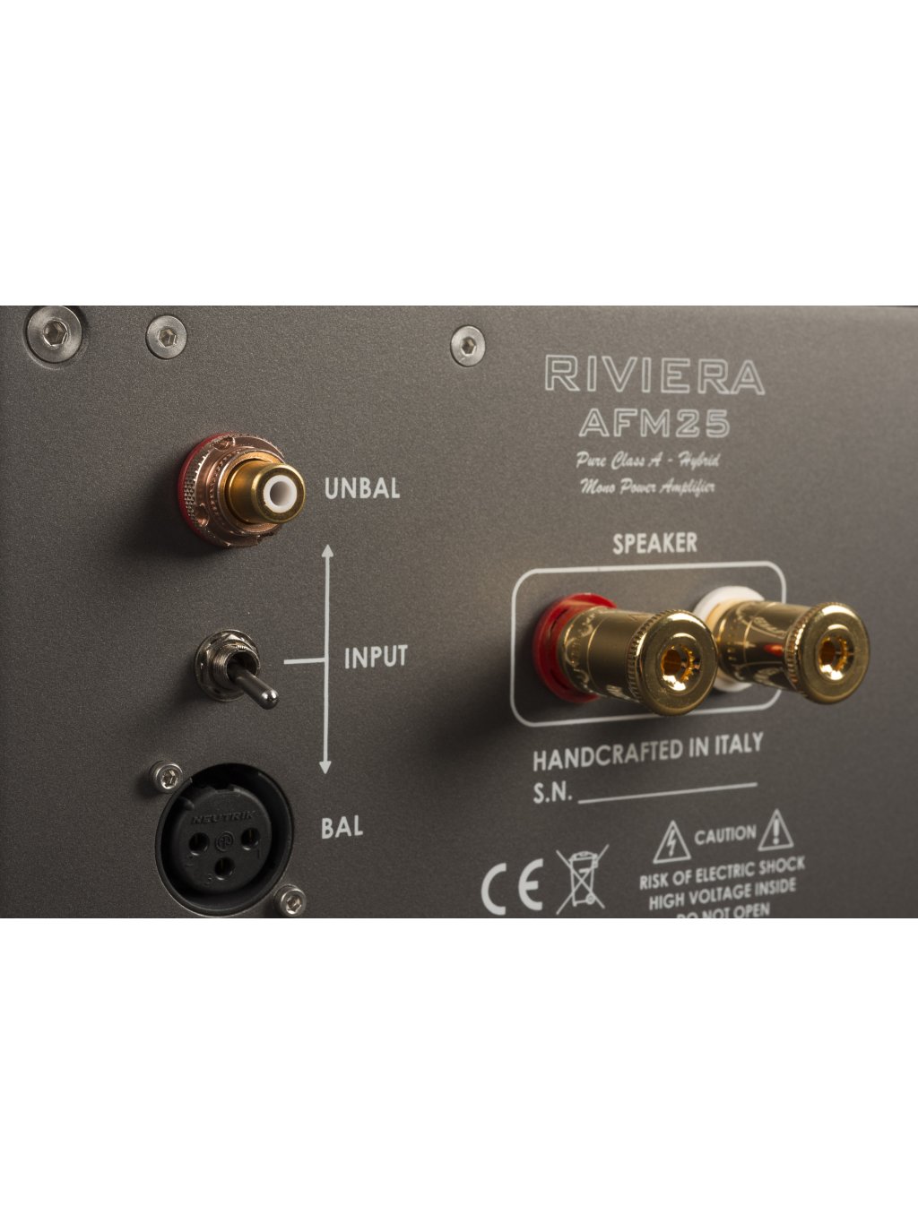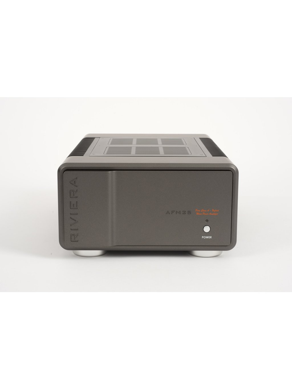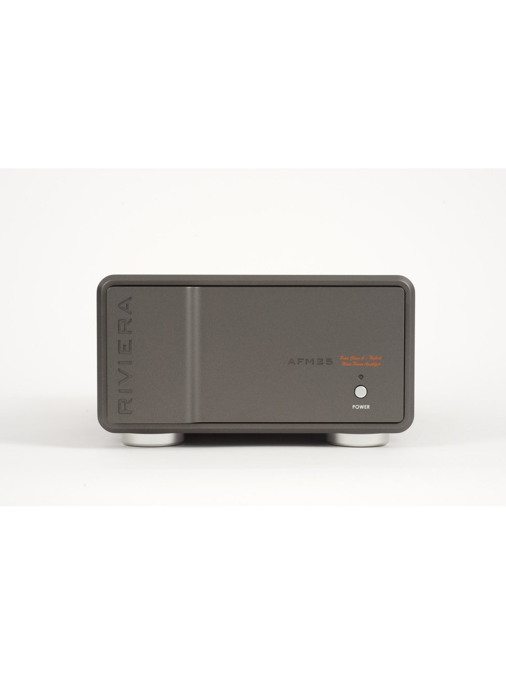 Monofonní zesilovač AFM25 je hybridní mono výkonový zesilovač třídy A, který v sobě spojuje všechny základní principy zesilovačů Riviera: nulovou celkovou zpětnou vazbu, hybridní konstrukci (elektronky pro zesílení napětí, polovodičové prvky pro výkon) a čistý provoz třídy A. AFM25 poskytuje výkon 25 W do 8 ohmů ve třídě A (50 W do 4 ohmů) a je schopen pohánět reproduktory s výjimečnou přirozeností.